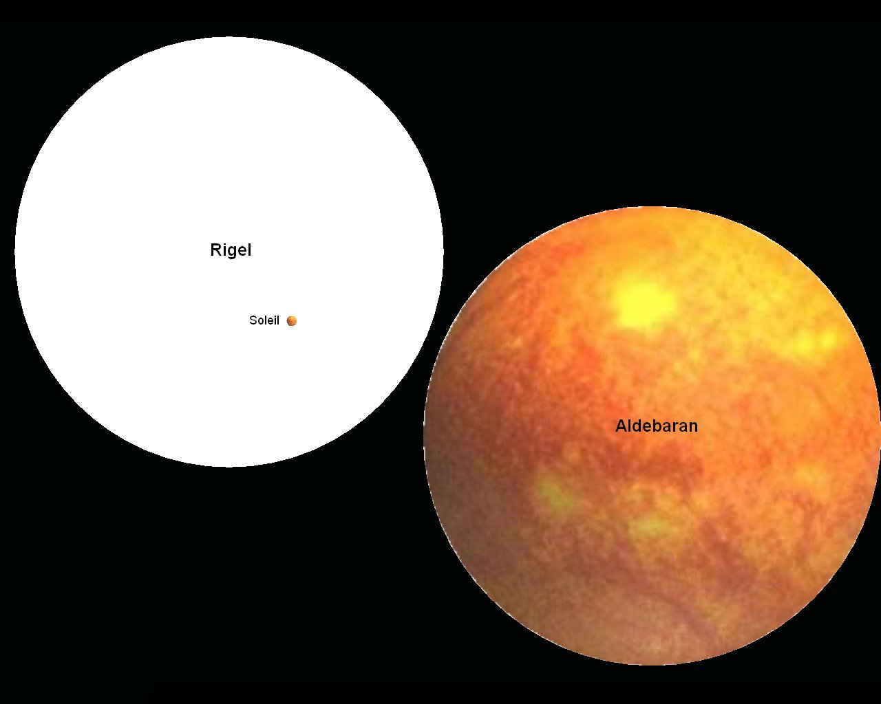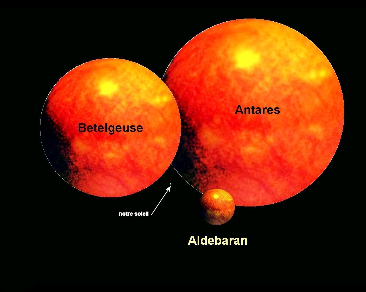 Notre soleil et quelques très grosses étoiles. Notre étoile (le soleil) se trouve entre Betelgeuse et Antares: c'est le point jaune (dont la taille est un peu exagérée pour être visible...)