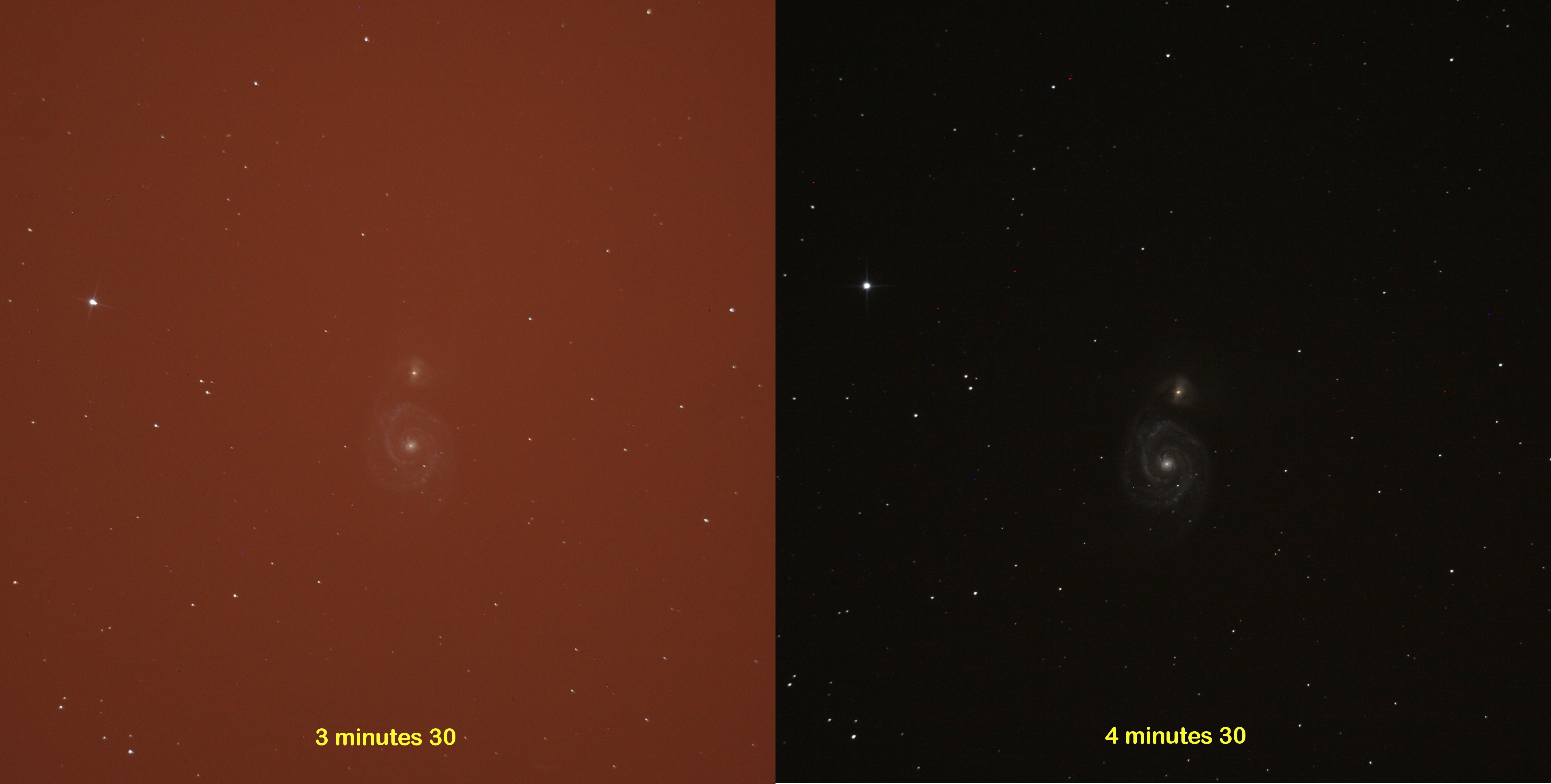 La couleur orange et la perte de contraste de la photo de gauche est simplement la pollution lumineuse visible de chez moi, en périphérie d'un village qui éclaire violemment le sol et le ciel toute la nuit, dans toutes les rues et les ruelles de l'entité.
